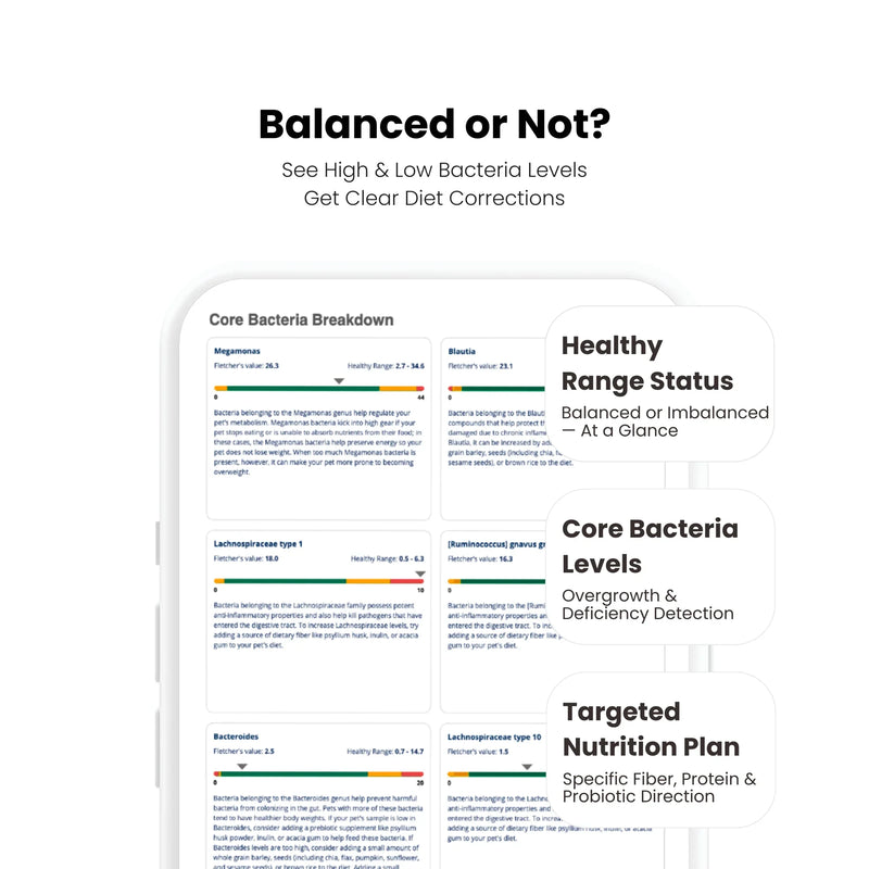 Full breakdown of your pet’s unique gut profile vs. healthy benchmarks.